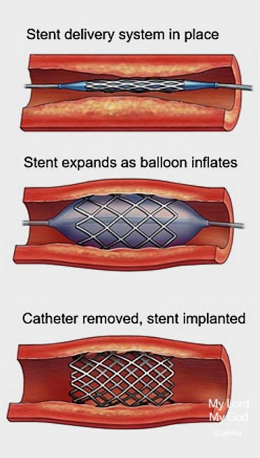 * 확장 및 삽입: 막힌 관상동맥 부위에 도달하면, 카테터 끝에 달린 풍선을 팽창시켜 좁아진 혈관을 넓힌 후, 그 자리에 스텐트라는 작은 금속 그물망을 펼쳐 혈관 벽에 고정시킨다.