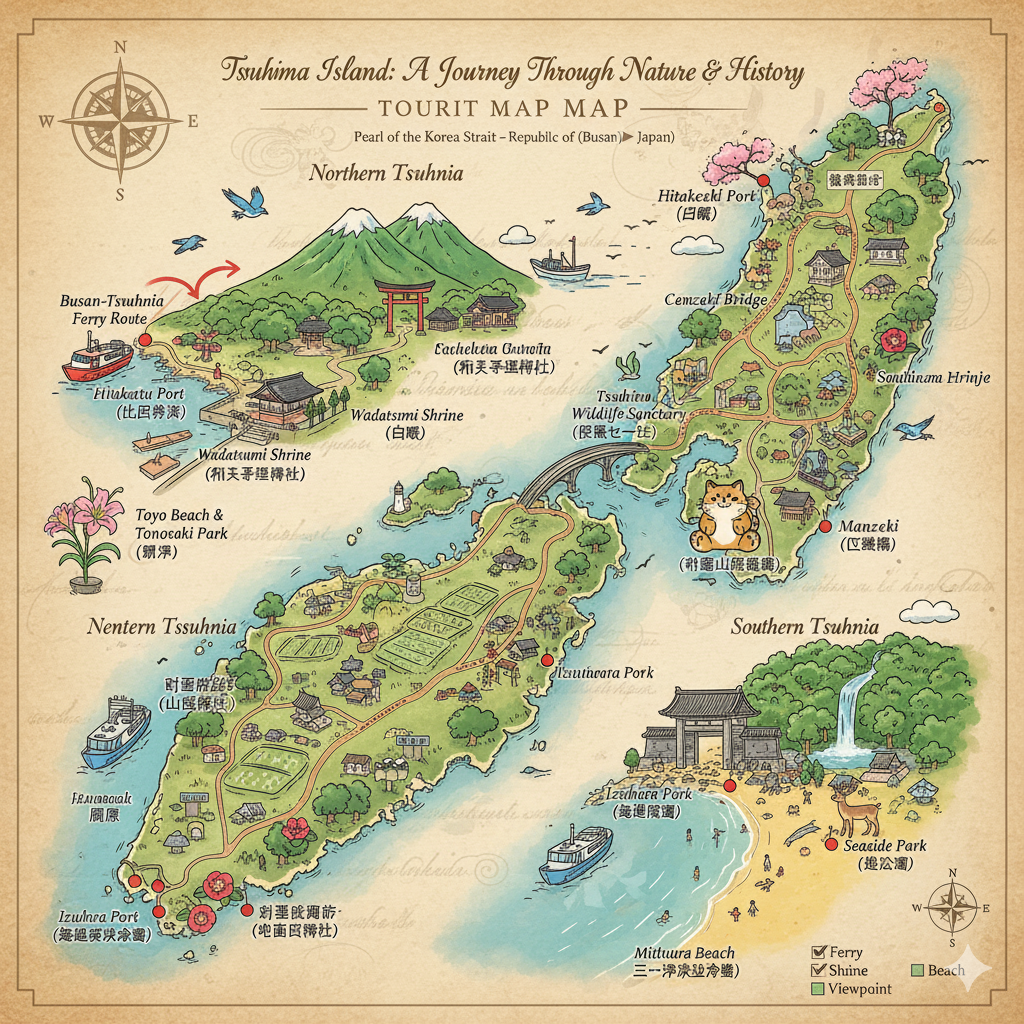 참고: 부산에서 가장 가까운 항구는 북쪽에 위치한 히타카츠항이며, 보통 당일치기나 짧은 여행 시 많이 이용합니다. 남쪽에 있는 이즈하라항은 쓰시마의 중심지입니다.