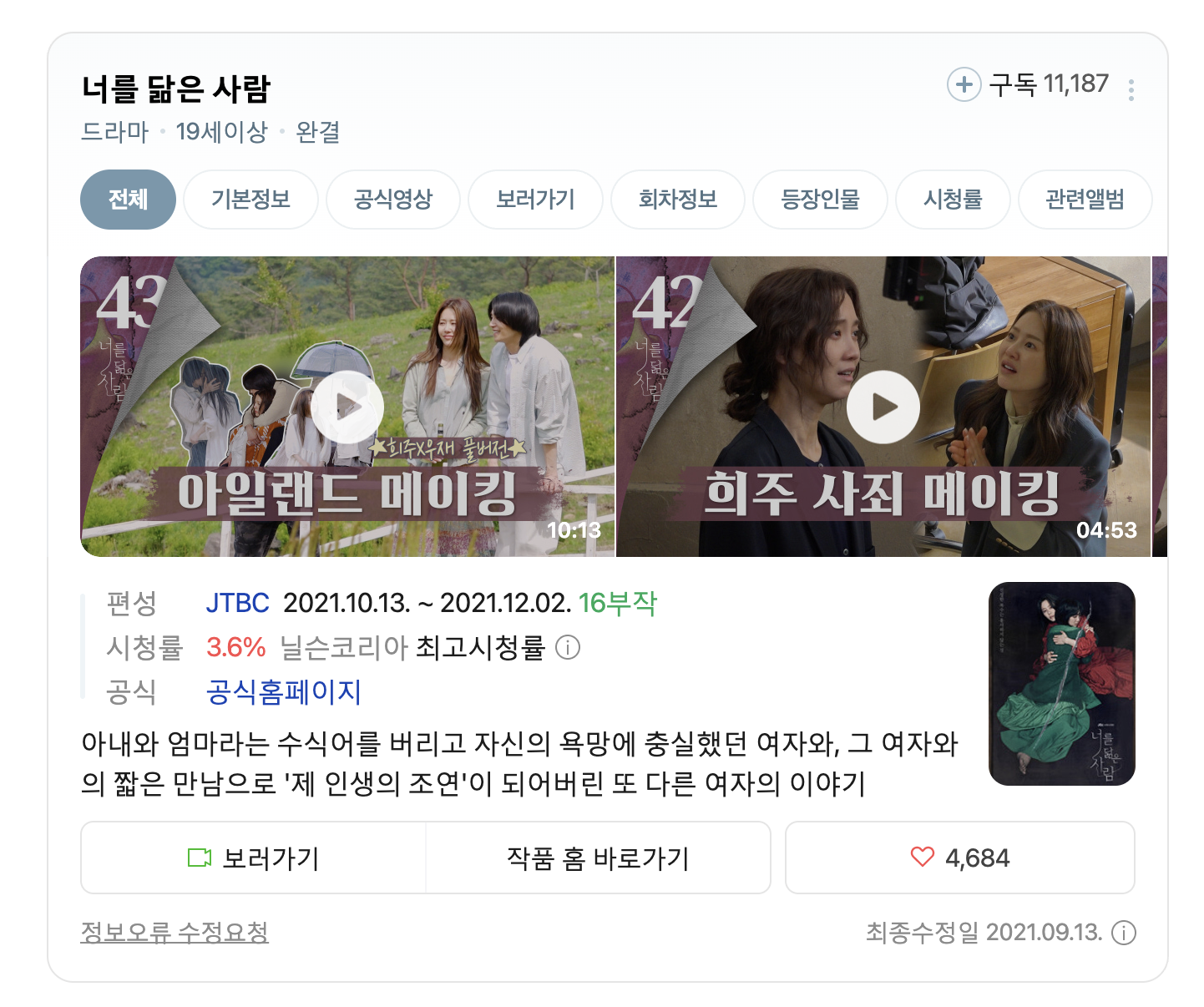 제가 좋아하는 드라마 [너를 닮은 사람]으로 한 번 가늠해 보죠.